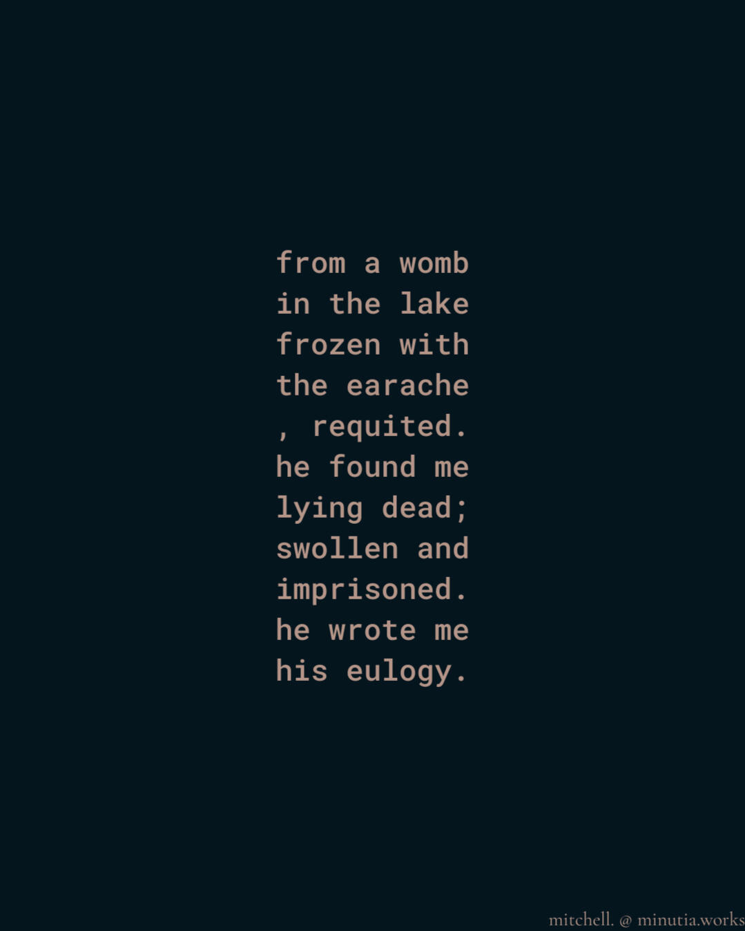 Dank pitch and a rent-a-suit enfolds me. When I was lowered, I counted—this ain't even six feet, it’s four. And I asked to be cremated! If it weren’t so tight, I’d be rolling over. What’s left but the susurrus of critters, wriggling, pushing dirt to come knocking? To take me home.